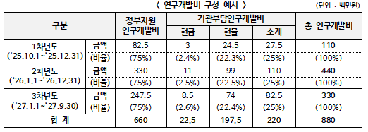 ** 기관부담연구개발비 : 기관(중소기업) 총 연구개발비의 25% 이상 부담하여야 하며,