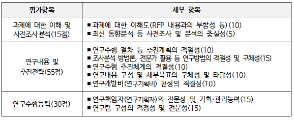 ②연구수행능력, ③연구내용 및 추진전략 항목