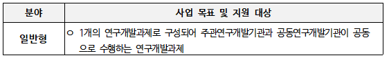 ○ 일반형 : 총 1개 연구개발과제로 구성되어 주관연구개발기관과 공동연구개발기관이