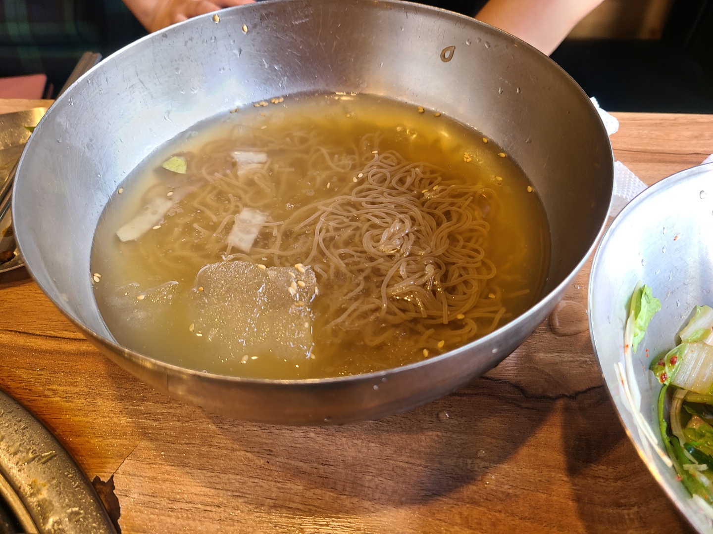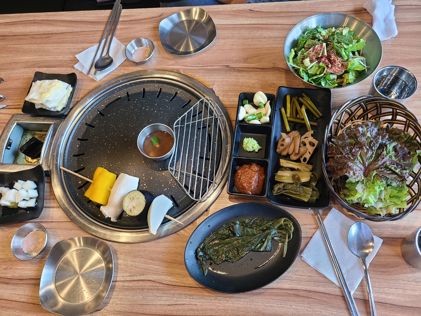 기본반찬은 쌈채소, 명이나물, 된장찌개, 백김치, 멸젖, 와사비, 핑크소금 등이 나옵니다.