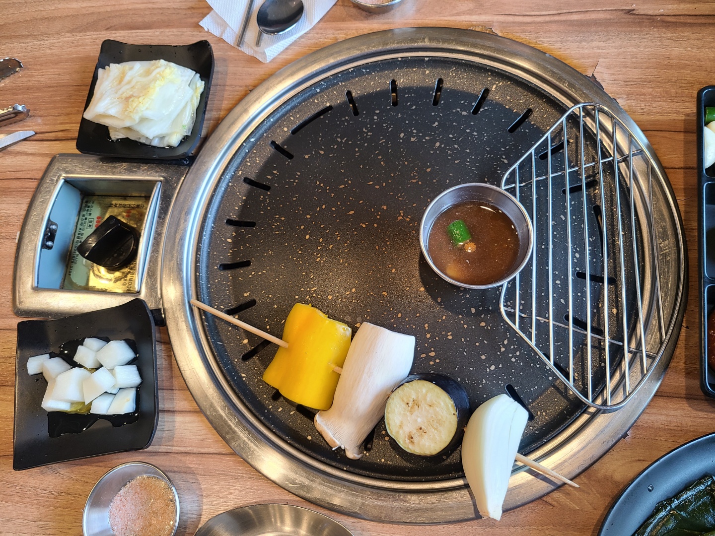 고기랑 같이 구워 먹을 수 있게 가지, 양파, 버섯, 피망이 있는 꼬치가 나와서 맛있게 잘먹었어요.