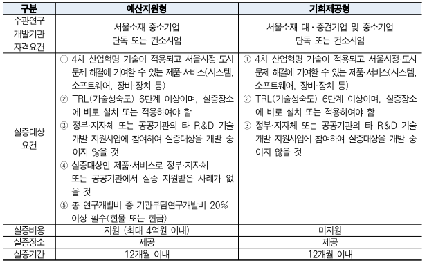 ○ 실증비용 지원여부에 따라 예산지원형과 기회제공형으로 구분, 택일하여 지원