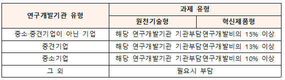 ※ 사업별 특성에 따라 기관부담연구개발비 현금의 부담 기준이 다를 수 있으므로 개별 사업 공고를 참조