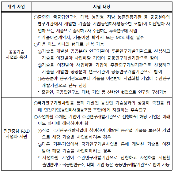 농산물 분야 우수 기술(국가 R&D 성과 및 민간 자체 보유기술)의 후속 연구 및 사업화 연계를