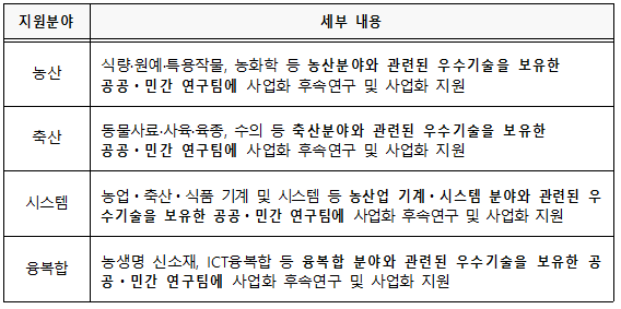 * '후속사업화'는 농산, 축산, 기계·시스템, 융복합 분야에 공공기술사업화촉진 각 3과제씩,