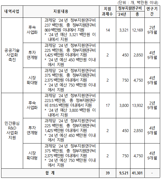 ▣ 공고 규모 : '24년 정부출연금 95.2억 원 이내, 39개 과제