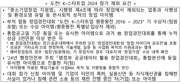 ○ 「도전! K-스타트업 2024」의 참가 요건을 준용하며, 아래 요건 중 한 가지라도 해당될 경우