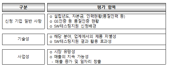 - 신청 기업이 제출한 신청 서류에 대해 신청 기업 일반사항, 제품 기술성 및 사업성