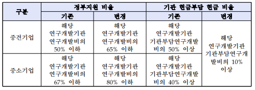 ② 연구개발기관에서 부담해야 할 기관부담연구개발비 중 현금부담비율은 다음과 같음